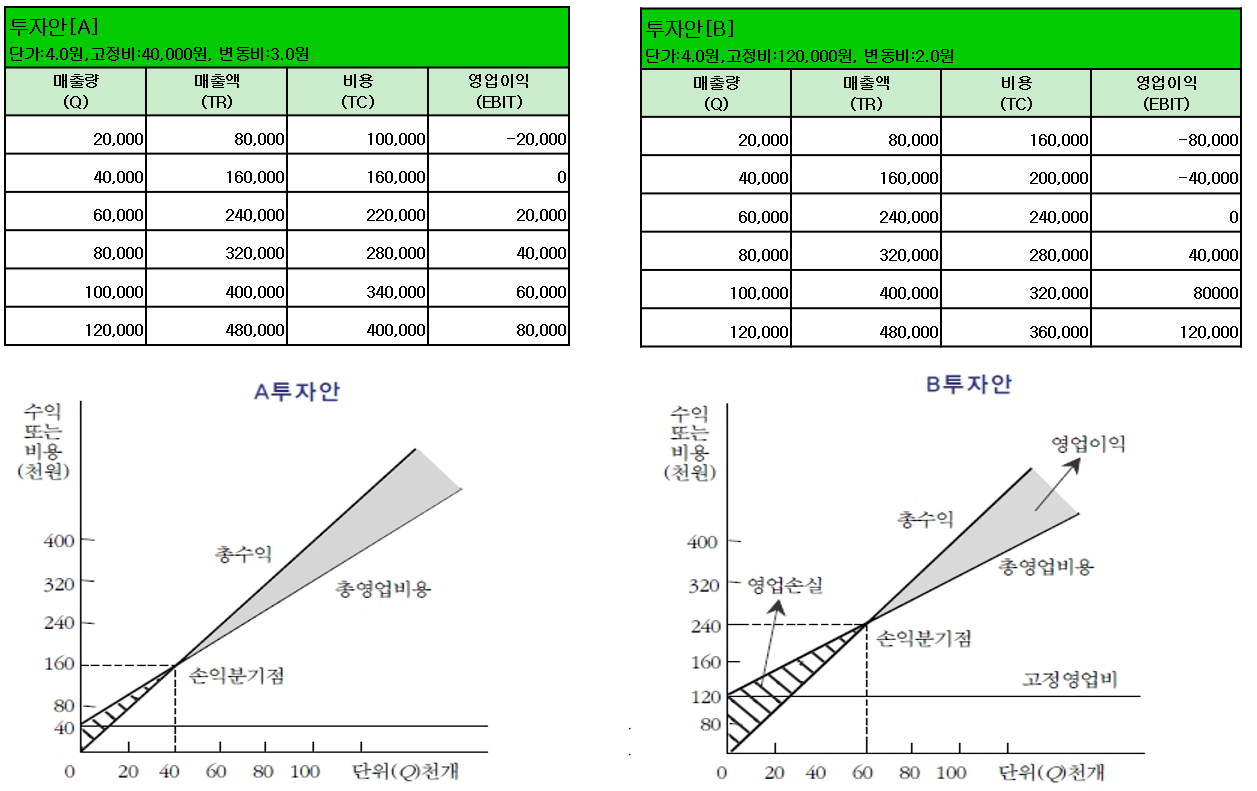 -사례에서 손익분기점을 지난 매출량 80,000단위 수준에서 매출량이 변할 때 투자안 B가 투자안 A보다 영업이익의 변화율이 큽니다.